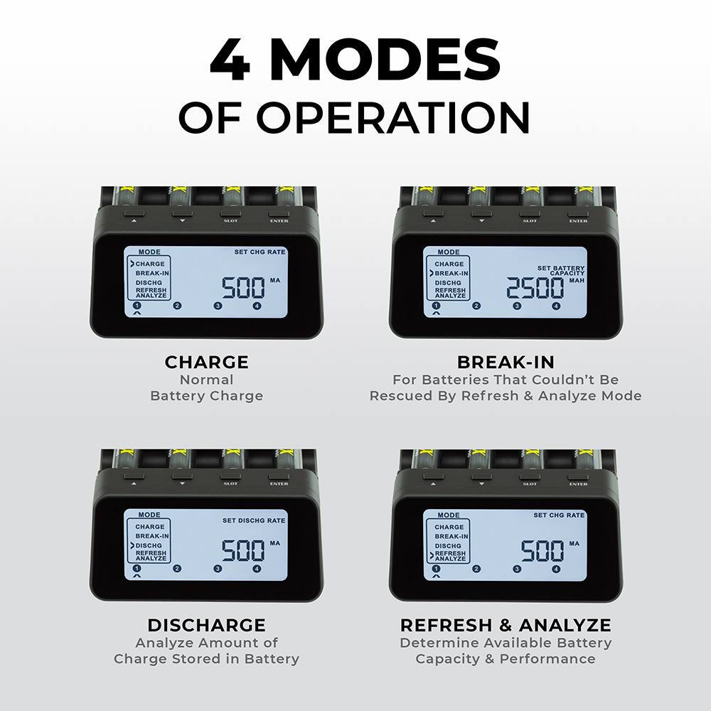 - 4 Modes of Operation: Charge, Break-In, Discharge, and Refresh & Analyze