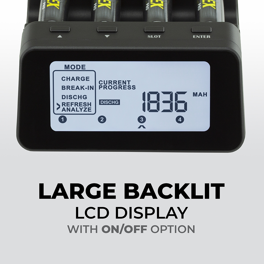 Maha Energy is excited about this long anticipated charger launch. We believe the improved features of the MH-C9000PRO Professional Charger-Analyzer will exceed user needs. The charger is compact sized, measuring at 4.25” x 4.25” x 2” (LWH) and has a large backlit LCD screen with an on and off option.