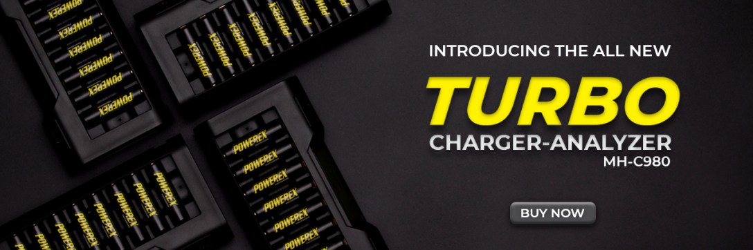 DESCRIPTION: The Powerex MH-C980 Turbo Charger-Analyzer charges up to 8 AA or AAA nickel-metal hydride batteries in approximately 1 hour. This charger is the best combination of an 8-cell charger with battery health analyzing features. It has a special One-Touch Battery Health Analyzer with actual capacity readout to provide the most accurate data. The Turbo… Continue reading New Product Announcement – MH-C980 Turbo Charger-Analyzer for 8 AA / AAA Rechargeable Batteries